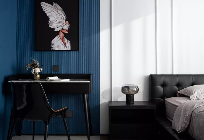 深藍(lán)色勾畫出男主人的閱讀區(qū),海基布以其細(xì)密的紋理提升著空間質(zhì)感。